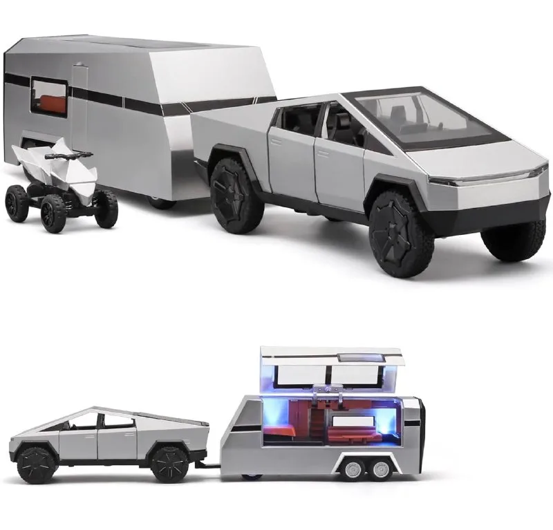 צעצוע דגם טסלה סייברטראק עם קרוואן ורכב שטח