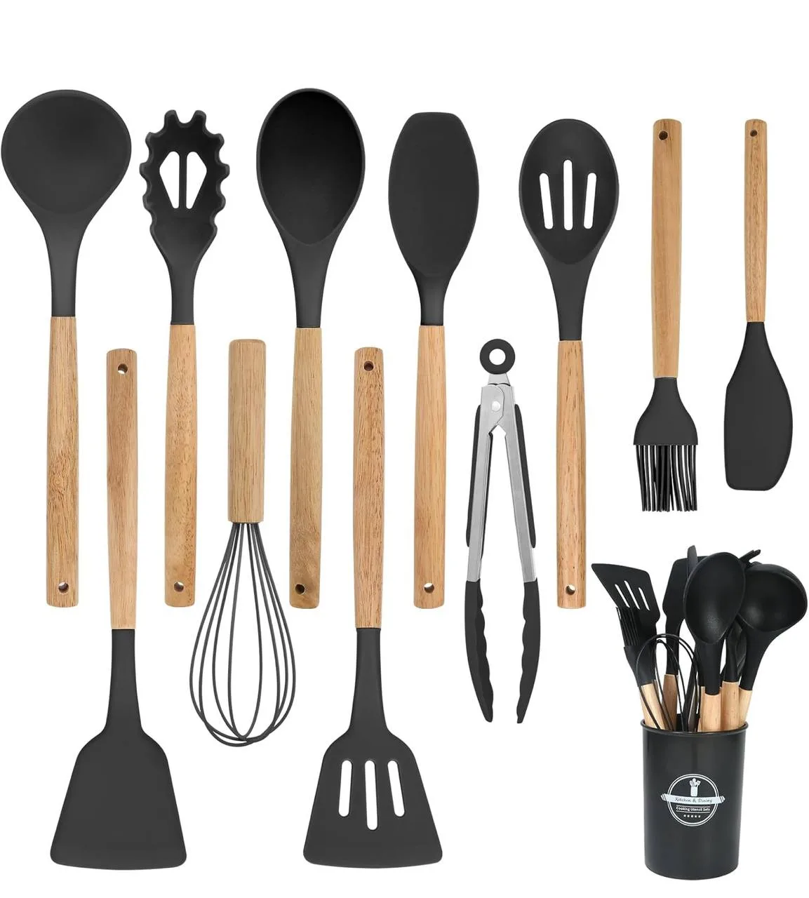סט 12 כלי מטבח מסיליקון וידיות עץ