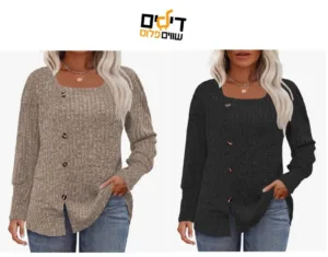 עיצוב ייחודי: מחשוף מרובע עם שרוולים ארוכים וכפתורים דקורטיביים להשלמת המראה.