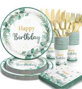 מתאים ל-24 אורחים: כולל צלחות, מפיות וכוסות בעיצוב ירוק מרווה עם נגיעות זהב.