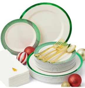 סט מלא ל-25 סועדים: כולל צלחות, סכו”ם ומפיות בעיצוב אלגנטי של ירוק שנהב וכסף.