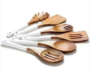 🔸 עשוי מעץ שיטה טבעי: סט איכותי הכולל כף, כף מחוררת, מרית, מרית מחוררת, מזלג לסלט וכף לספגטי.