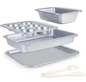 🔸 סט מגוון ושימושי – כולל תבנית כיכר, תבנית מאפינס 6 שקעים, תבנית עוגיות, תבנית צלייה, מברשת וספטולה.