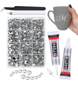 🔸 ערכה מושלמת: כוללת דבק B7000 איכותי ושפע של אבני חן שטוחות בצבע כסוף-לבן.