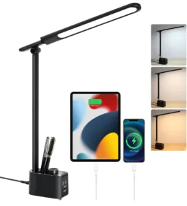מנורת LED מתקפלת Lightess עם 2 יציאות USB, שעון ותא לעטים