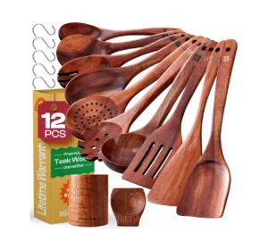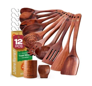 🔸 12 חלקים מעץ טיק טבעי: כולל כפות, מרית, מזלג ערבוב ועוד – הכל לשימוש יומיומי