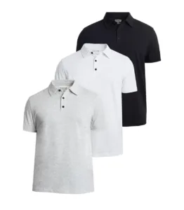 🔸 סט של 3 חולצות פולו בצבעים שחור, לבן ואפור.