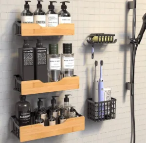 ערכת 5 מדפי מקלחת מנירוסטה בשילוב עץ במבוק מבית DUSASA – פתרון עמיד, אלגנטי ופשוט להתקנה!