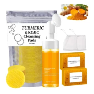 ערכת טיפוח טבעית הכוללת סבון, ג׳ל ניקוי ורפידות פילינג – מבוססת כורכום לניקוי עמוק והבהרת העור