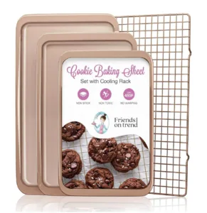 סט 3 תבניות אפייה איכותיות בציפוי Non-Stick + רשת נירוסטה – מושלם לעוגיות, לחמים, ירקות קלויים ועוד. כולל חצי מגש, רבע מגש ותבנית קטנה, כולם בטוחים לשימוש בתנור וללא חומרים רעילים.