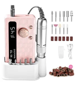 מקדחת ציפורניים חשמלית נטענת – 45,000 סל״ד עם מסך לד ראשים שונים ובסיס טעינה נוח.