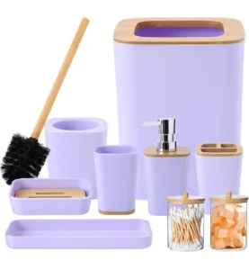 🔸 סט של 9 חלקים – כולל פח אשפה, מחזיק מברשות שיניים, כוס, מתקן לסבון נוזלי, מגש, סבוניה, מברשת שירותים וקופסה ל-Qtips