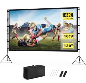 מסך הקרנה ענק בגודל 120 אינץ’ מבית KHQ, כולל מעמד יציב ותיק נשיאה – מושלם לערבי סרטים, משחקי ספורט או הקרנות משפחתיות בחצר או בבית.