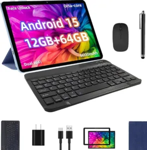 טאבלט 10 אינץ’ עם מקלדת ועכבר, Android 15, זיכרון 12GB, אחסון 64GB עם הרחבה עד 1TB