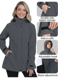 מעיל סופטשל לנשים במגוון צבעים ומידות עם בטנת פליז, עמיד לגשם ורוח וכולל כובע.