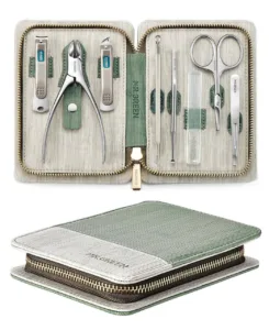 כלי טיפוח מנירוסטה איכותית לשימוש יומיומי בבית או בנסיעות, מסודרים בנרתיק קומפקטי ואלגנטי