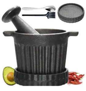סט מכתש מברזל יצוק עם צלחת גירוד לשום – פתרון קומפקטי להכנת פסטו, גוואקמולי, תבלינים ושום טרי כמו במסעדות.
