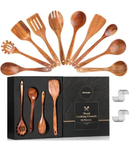 סט כלי בישול מעץ טיק – מארז 10 כפות וכלים איכותיים עם גימור חלק, נוחים ליד, ושומרים על הסירים והמחבתות בלי לשרוט.
