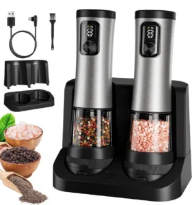 סט מטחנות מלח ופלפל חשמליות נטענות עם שתי מהירויות טחינה, קיבולת גדולה 100 מ״ל, עשויות נירוסטה איכותית, עם תאורת LED וטעינת USB עם בסיס טעינה