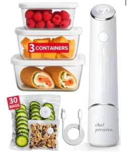 מכשיר ואקום מבית Chef Preserve כולל 3 קופסאות ואקום מזכוכית ו-30 שקיות ואקום רב־פעמיות