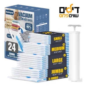 ערכת ענק הכוללת שקיות ב-5 גדלים שונים (מגודל סמול ועד ג’מבו) שמתאימות להכל: מבגדים ועד שמיכות פוך עבות וכריות.