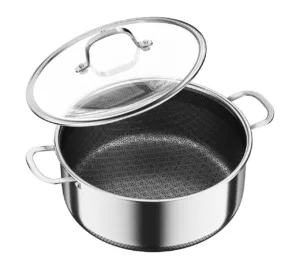 סיר נירוסטה מקצועי בנפח של כ־5.7 ליטר עם מבנה 5 שכבות לפיזור חום אחיד, ציפוי נון-סטיק ללא PFOA, מתאים לכל סוגי הכיריים כולל אינדוקציה, נכנס לתנור ולמדיח כלים