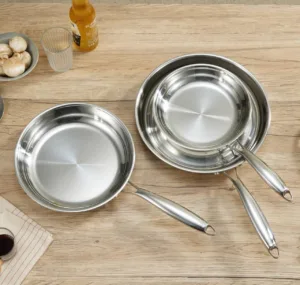 סט של 3 מחבתות איכותיות מנירוסטה Tri-Ply בגדלים 20, 25 ו־30 ס”מ מתאימות לגז, אינדוקציה, תנור ומדיח.