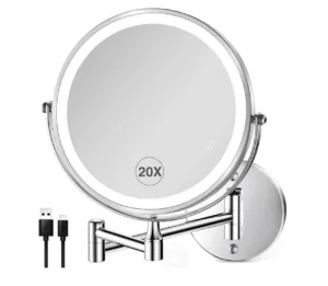 מראת איפור / גילוח כפולה עם תאורה מובנית, הגדלה ×20 / ×1, שליטה במגע וזרוע נשלפת עם 3 מצבי תאורה – חם / טבעי / קר, וסוללה נטענת 2000mAh עמיד לחלודה, מתאים לאמבטיה