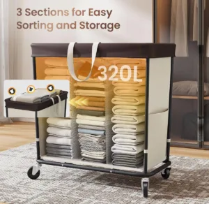 סל כביסה ענק 320 ליטר עם גלגלים ו־3 תאים נפרדים, מיון חכם, ניידות מלאה ונוחות יומיומית לבית, חדר רחצה או מעונות.