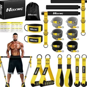 🔸 ערכה עוצמתית הכוללת מוט פלדה מצופה ספוג ו-6 רצועות התנגדות המגיעות לעומס של עד 150 ק”ג